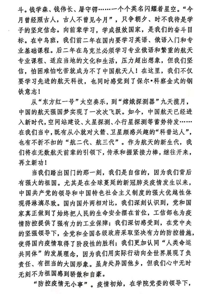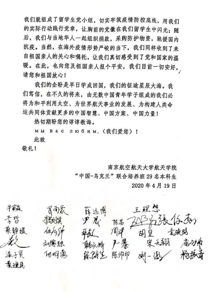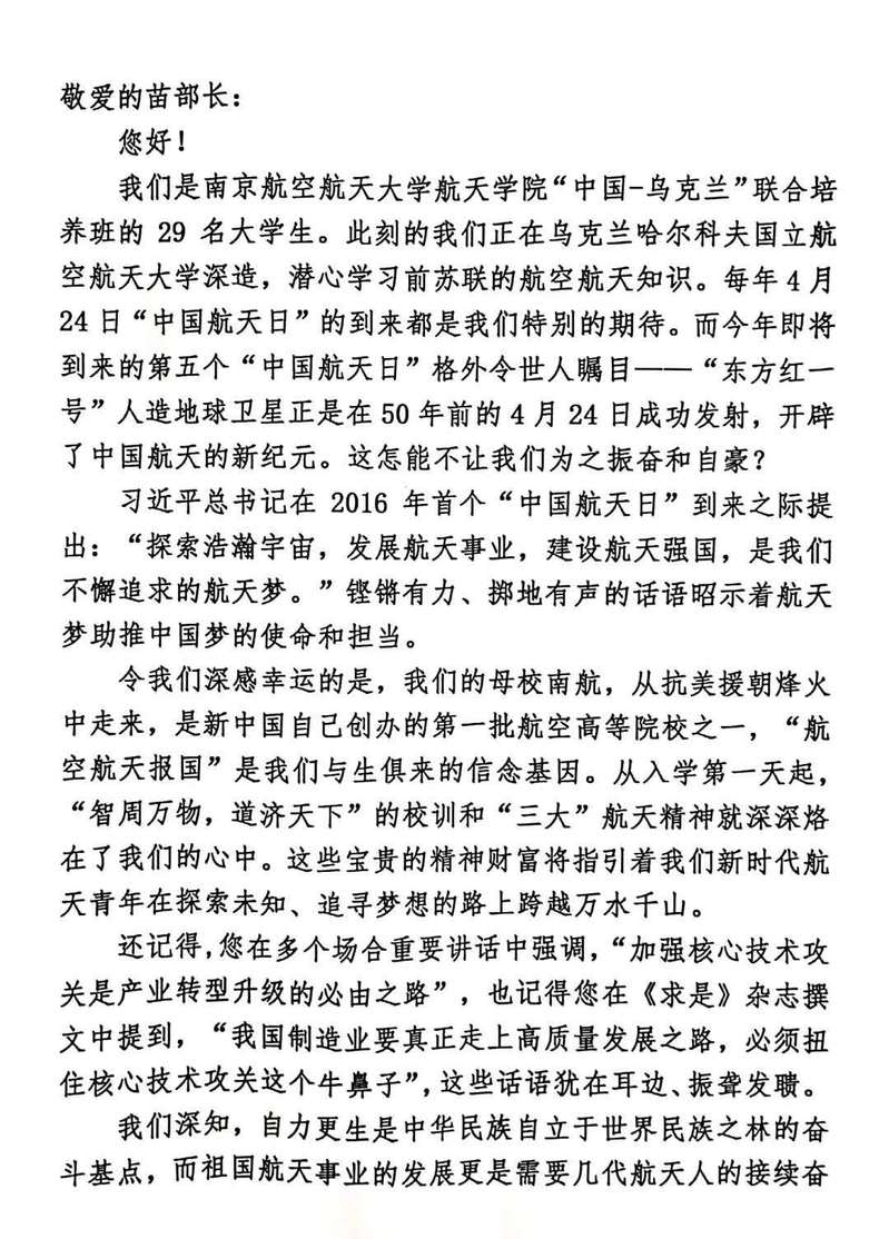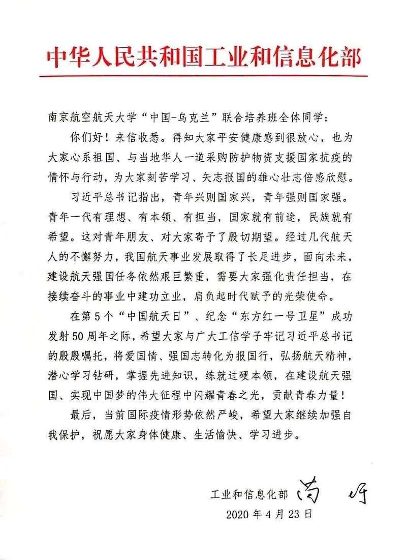 此前,正在乌克兰求学的“中乌班”的全体同学向苗圩部长写信,汇报了他们在乌克兰求学、疫情期间支援国内抗疫并收到祖国关怀的情况,表达了渴望学成归来、矢志报国、共筑航天梦的愿望。