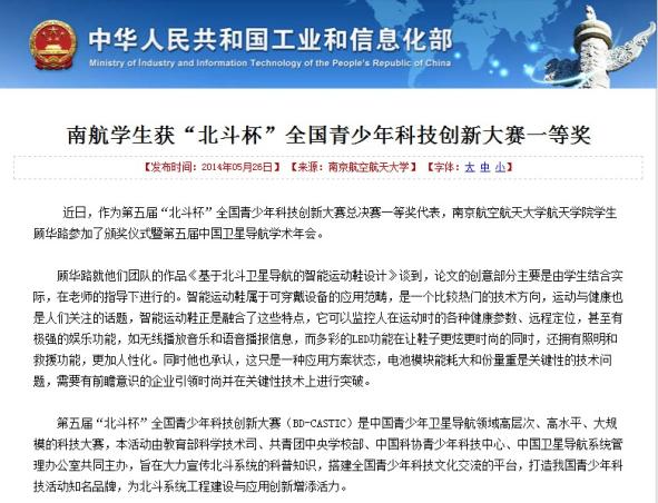 5月26日,工信部官方网站对我院学生获“北斗杯”全国青少年科技创新大赛一等奖进行了转载报道。