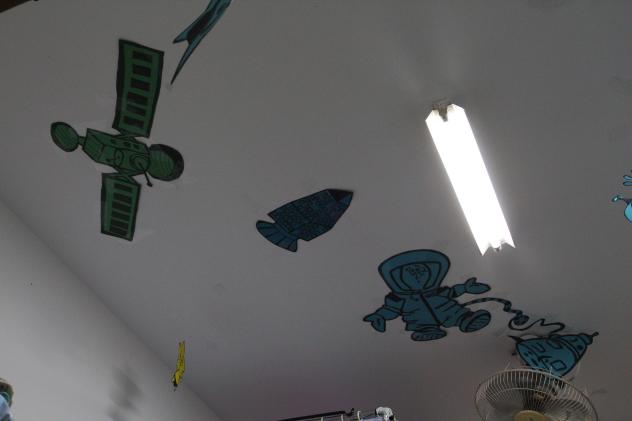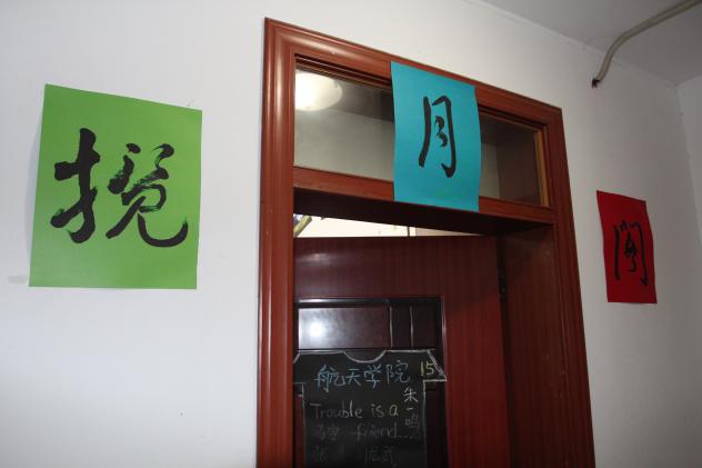 流云飘飘,热气球在空中悬浮,双臂前伸的小人儿在空中翱翔,不用猜,如此充满幻想和可爱的寝室绝对出自于女生的手笔。几张裁剪拼接好的彩色卡纸,几条白色的棉线,足以将整个寝室布置成唯美的空中乐园。飞上天是她们共同的愿望,就算日后她们自己无法真的到太空中去,也希望自己未来能够参与到航天器的研究中,让自己的作品遨游太空。