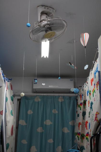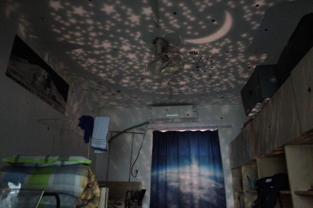 灯明,如同夜晚千千万万的寝室一样,这个小寝温馨而明亮。灯灭,却非见五指,只见头顶一片绚烂的星汉,群星之中新月如钩。天花板上是以星河为主题的夜光墙纸,墙壁上贴着的是画着航天器的海报,就连窗帘也换成了银河主题,为了营造航天的主题,这个小寝可谓是颇费苦心。