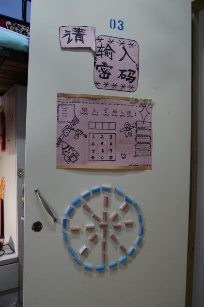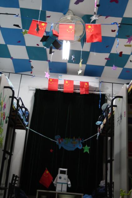 “请输入密码,输入密码才能入仓。”这个小寝的成员站在门前笑着说,门上,画着输入键盘的卡纸色彩明丽,环绕着各有特色的航天器图案。推开房门之后,悬挂了整个天花板的星星闯入了我们的眼帘。粉的,浅蓝的,鹅黄的,大小不一的星星顿时让整个寝室活泼起来,圆圆的五角更是有着说不出的可爱。