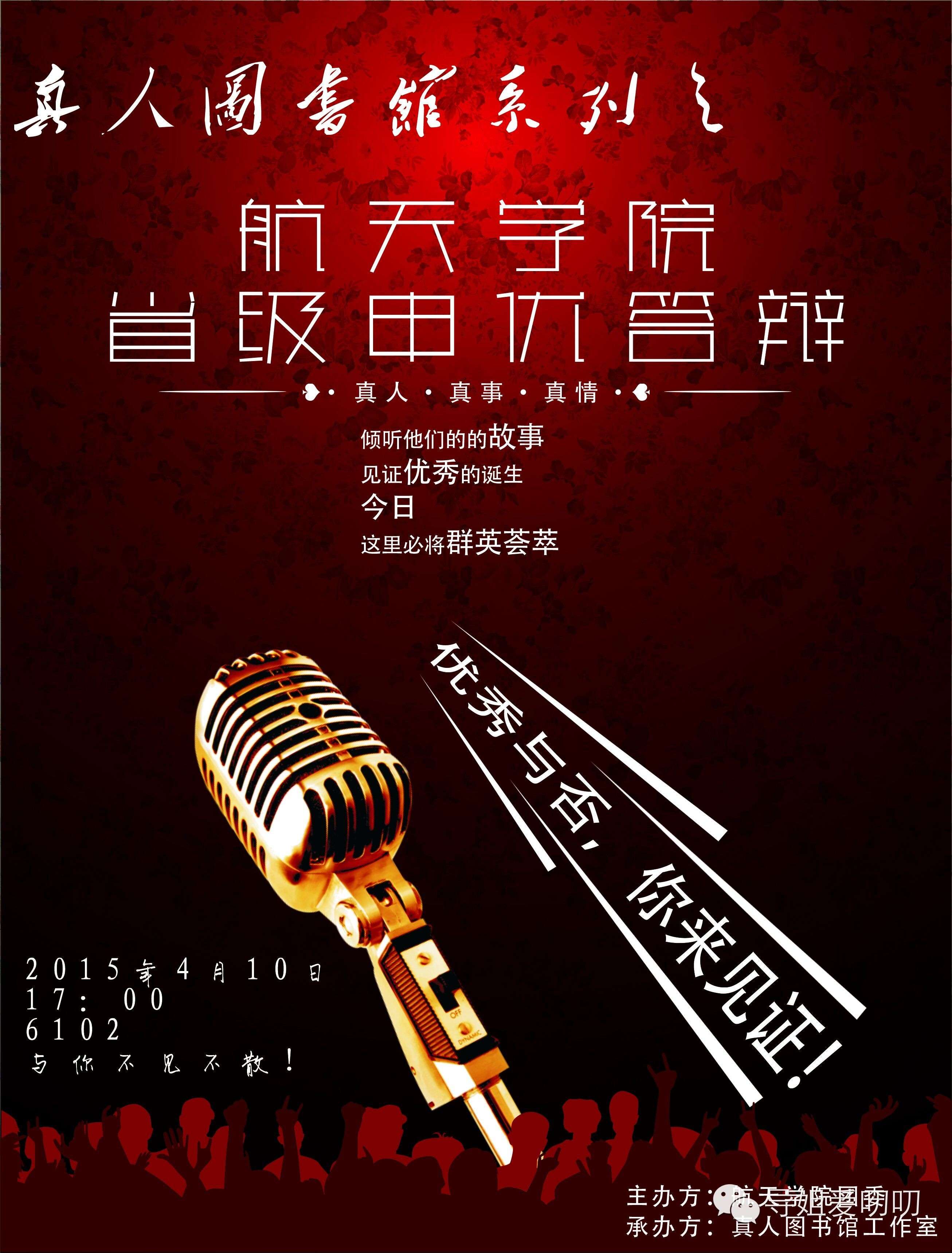 2015年4月10日晚7点,“爱在航天真人图书馆”第三期在6102教室顺利举行。本次活动由12、13级辅导员范伟主持,由刘伟伟、李莉、郭萧、赖江、阮若水、李宇6位嘉宾到场讲述他们优秀的故事,以3年的成长故事打动在场6位评委的心,通过每位在场评委的每人2票的投票权选出省级三好学生、省级优秀团干。