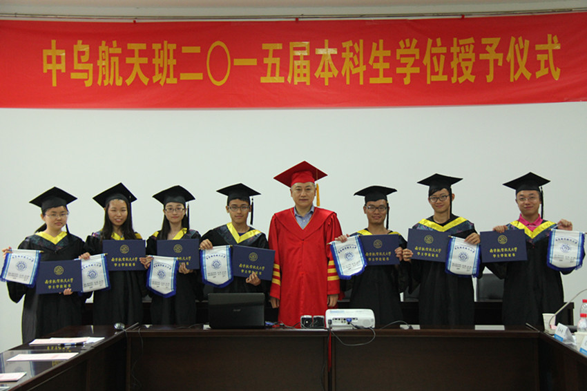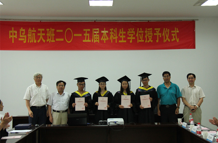 7月3日下午,我校中乌航天班2015届本科生毕业典礼暨学位授予仪式在明故宫校区A3-318会议室举行。学校教务处处长王成华、国际合作交流处处长金泉元、国际教育学院院长何宁、宣传部副部长孔令华、研究生院副院长王亚彤、学生处副处长许爱华等职能部门领导以及英国正版365官方网站院长陈卫东、党委书记季海群、副院长王海涛出席仪式,中乌航天班2015届毕业生以及2013级中乌航天班部分同学参加了仪式。仪式由英国正版365官方网站党委副书记李和新主持。