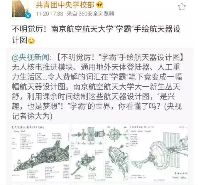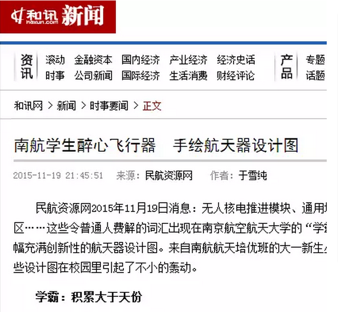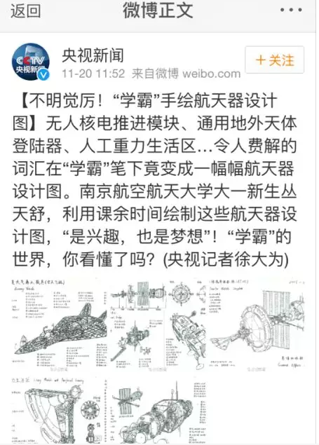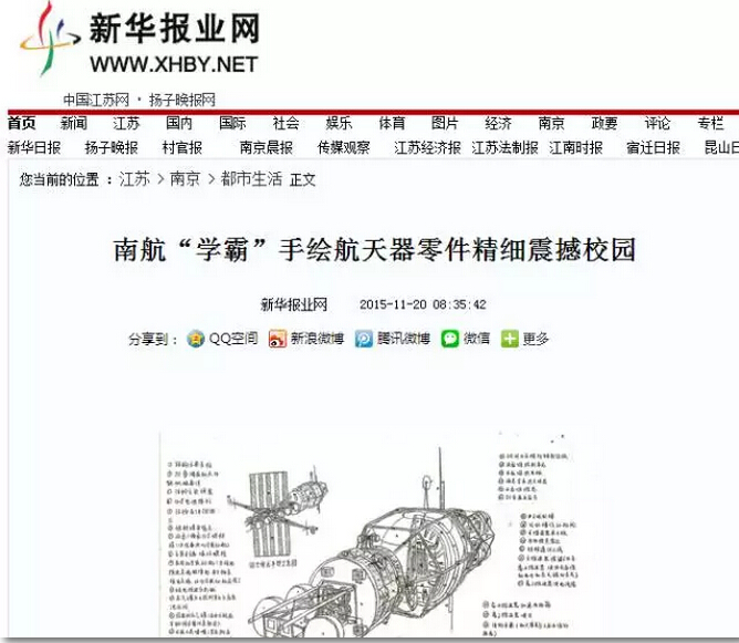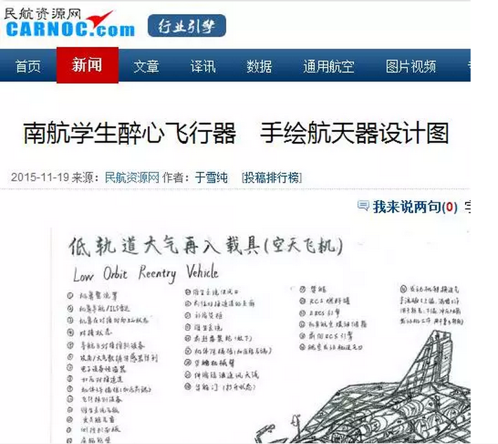 最近,南京航空航天大学校园内一系列令人震撼的手绘飞行器设计图受到多家媒体的关注报道,新华报业网、中国江苏网、南京晨报、和讯新闻、腾讯大苏网、民航资源网、龙虎网等,同时被央视新闻、共青团中央学校部、中国航天科工等官方微博进行转载,转发量2000+次,点赞量5000+次,截止小编发稿前,转发还在继续,点赞还在蜂拥而至!据了解,手绘作品来自我院2015级培优班的丛天舒同学,外号五哥!究竟是怎样的手绘图能受到如此的追捧和点赞?当高大上的飞行器遇到唯美清新的手绘设计,当科学遇上艺术,兴趣也能成就梦想!让我们一起来一睹为快!