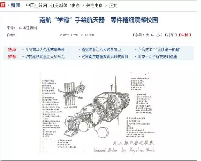 丛天舒画出这些设计图的初衷,是为了和同学一起参加南航举办的创新DIY大赛,与以前所画的任何设计图都不同,他这次的设计图将会直接运用在团队制作的航天器模型上。“在比赛中我们遇到的问题多的简直让我们措手不及,尤其是在设计和制作的对接上。我们手上并没有充足的材料,而为了能完整表现出我们的设计构想,尤其是无人核电推进模块这一部分,我们绞尽脑汁,把身边能用的材料都用上了。”由于最终的模型甚至用上了一个柚子外皮,他和团队的成员们也把自己的作品亲切的叫做“柚子号”。令他没有想到的是,无论是自己的设计图还是模型,都得到了老师和同学们的交口称赞。“这对我肯定是一种鼓励啊,既然我选择了航空航天器设计,就会一直坚持下去,利用在大学课堂上学到的知识,不断把这个兴趣发展下去。