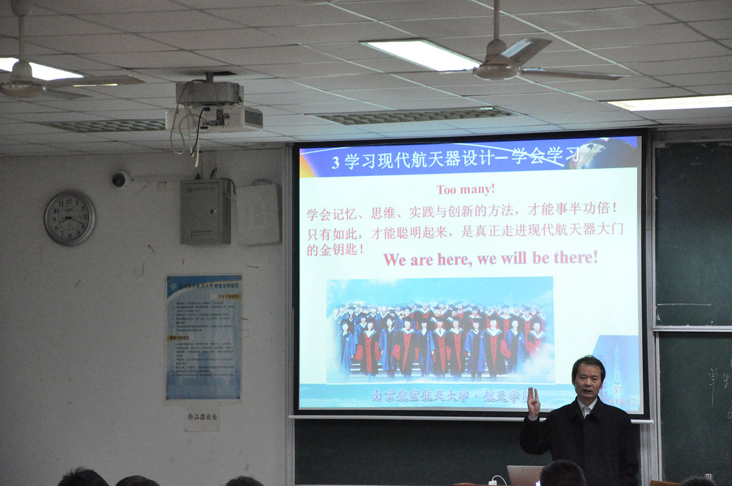 居教授开门见山的跟同学们指出飞行器(航天)设计专业的定位及培养学生的目标,让同学们了解了学院飞设(航天)专业的培养目标。同学们可以首先成为航天飞行设计的工程师、研究者,最终可以朝着卓越的总工程师及领导者的目标迈进。教授一再强调中国航天事业的发展需要老一辈的奉献者,也特别需要我们这些具有活力的年青一代。