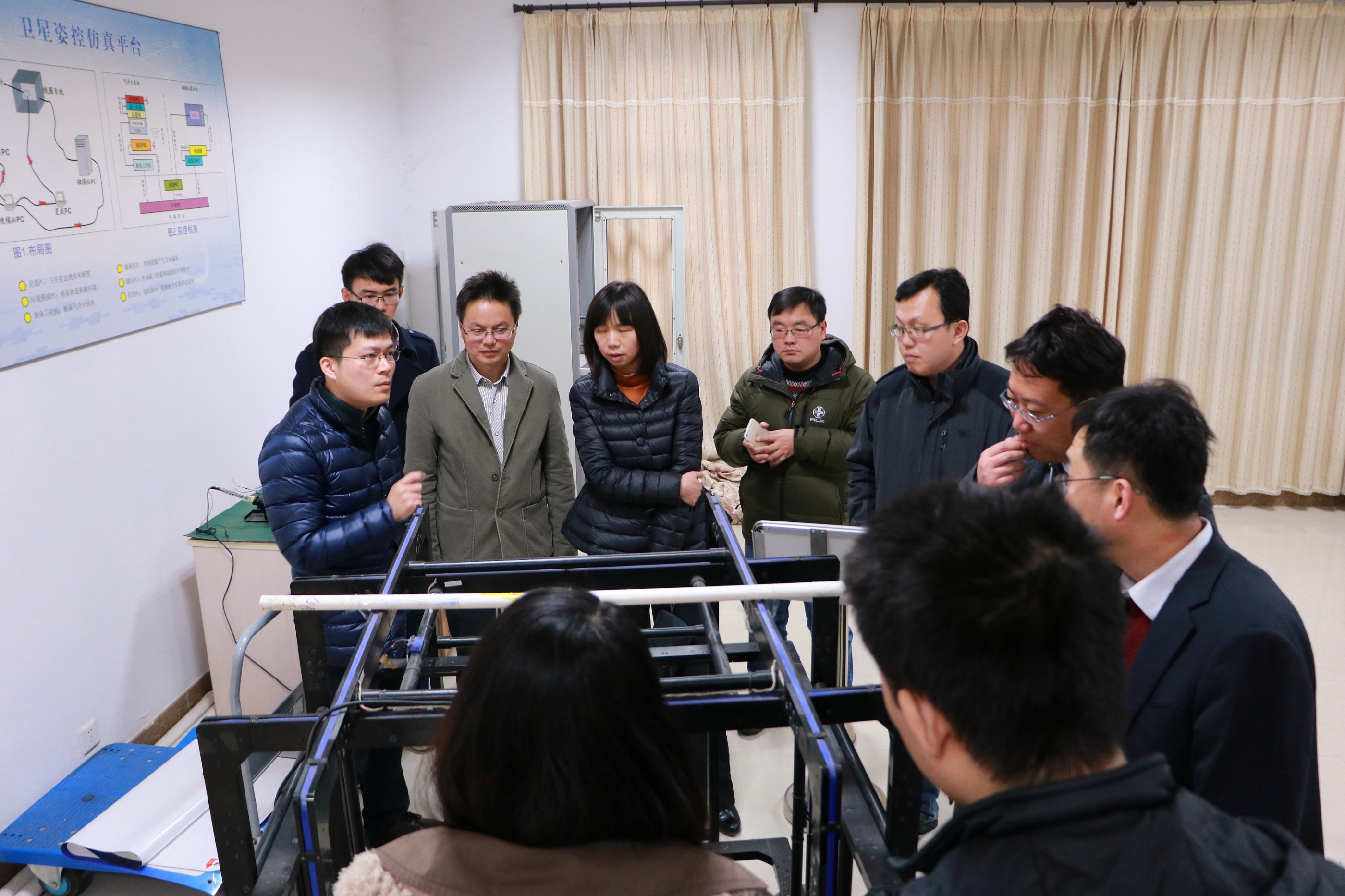 座谈结束后,微小卫星研究中心主任康国华老师带领八〇三所来访人员一起参观英国正版365官方网站重点实验室,并对实验室的气浮台项目、模拟星项目、卫星测控中心等进行了详细的讲解,党委书记季海群老师和控制系主任闻新老师、12级辅导员徐伟证全程陪同。八〇三所来访人员对英国正版365官方网站的实验室项目和学生产生了强烈的兴趣,期待将来能进行深层的项目合作,并能引进英国正版365官方网站学生毕业后到八〇三所,一起推动航天控制技术的发展。