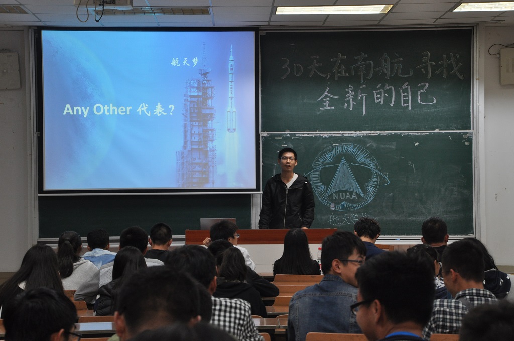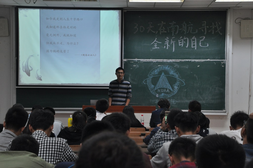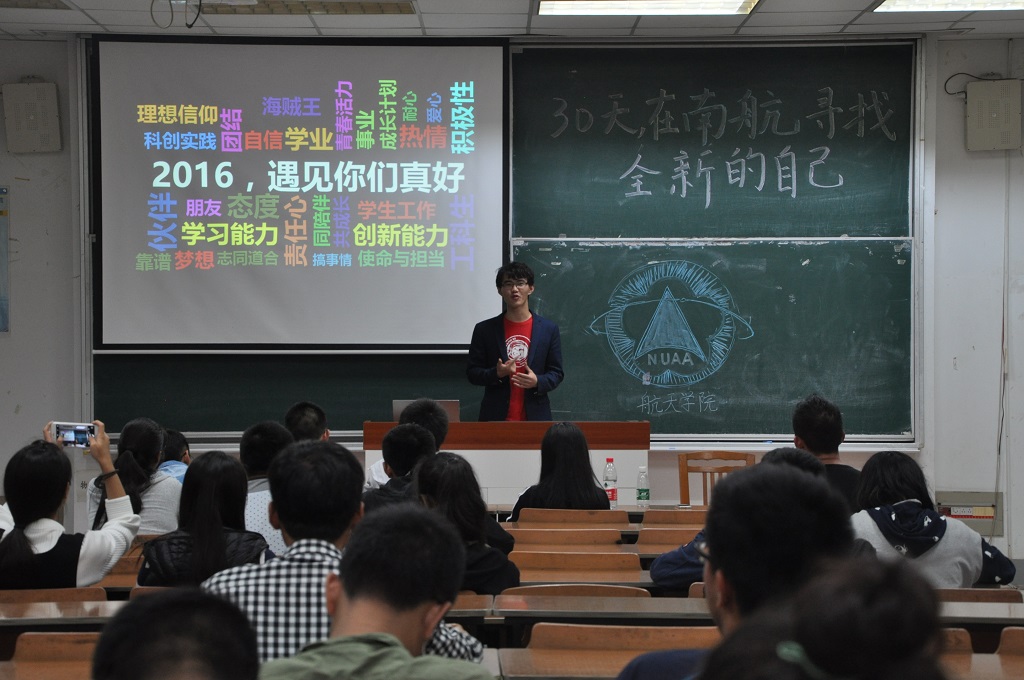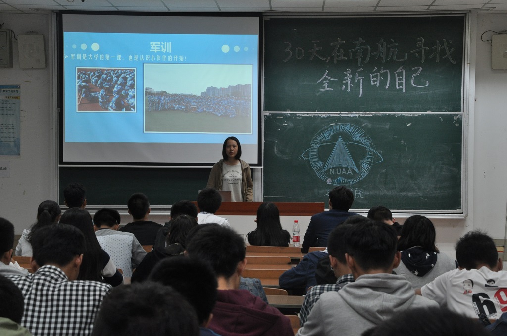 “30天,在南航寻找全新的自己”开学季系列活动有序开展近一个月,10月22日晚上6点半,我院2016级在6201教室组织了“30天,在南航寻找全新的自己”年级分享会,新生们分享自己在南航30天的收获和成长,展望对未来的期待。