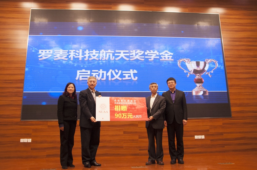 在随后进行的“罗麦科技航天奖学金”启动仪式中,张声远、王相东、陈卫东、张钟勤共同为“罗麦科技航天奖学金”揭幕,张声远宣布中国航天基金会、北京罗麦科技有限公司启明公益基金会共同向南航英国正版365官方网站捐赠90万元人民币,用于奖励南航英国正版365官方网站学习成绩优异、创新能力突出的学子。英国正版365官方网站党委副书记李和新宣读了第一届“罗麦科技航天奖学金”的获奖学生名单。到场嘉宾为获奖学生进行了颁奖。