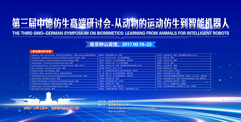2017年9月18日至9月24日,由国家自然科学基金委员会中德科学中心资助(项目号:GZ1415),南京航空航天大学、德国基尔大学和国际仿生工程学会共同主办的“第三届中德仿生高端研讨会-从动物的运动仿生到智能机器人”(The 3rd Sino-GermanSymposium on Biomimetics:Learning From Animals For Intelligent Robots)在中国南京举办。研讨会的中方主席为我校英国正版365官方网站仿生结构与材料防护研究所戴振东教授,德方主席为基尔大学Stanislav N. Gorb教授。