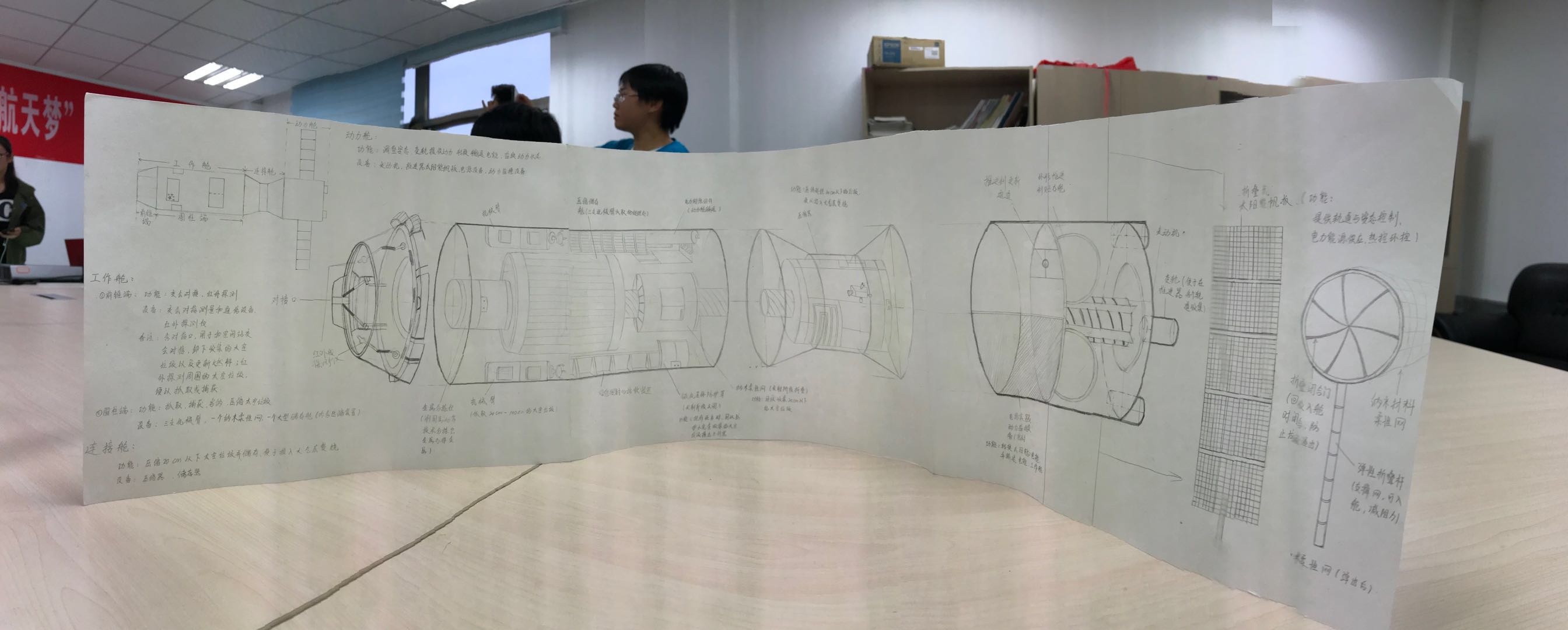 在答辩环节中,参赛团队针对作品的设计理念、创作过程、工作原理等进行了详细讲述。同学们利用生活中的废旧物品,如矿泉水瓶,易拉罐等,制作出了许多奇思妙想的创意模型,空间站、探测车、火箭、机器人等各种各样的航天飞行器也都在初赛中亮相,虽然这些概念早已提出并应用,但同学们在已有的基础上融合了自己的创意,改变了航天器的固有形态以及相应功能。评委们也针对答辩同学的陈述从对设计理念的构思的、实物模型的展示等方面进行了细致的提问,并给予了客观全面的建议和评价。