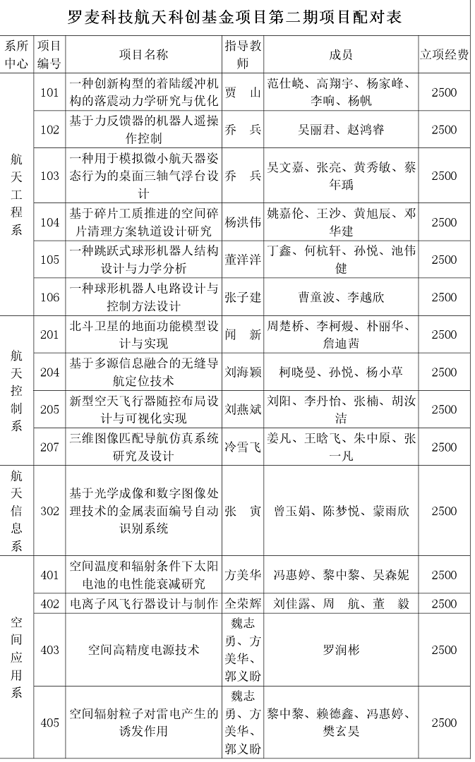罗麦科技航天科创基金成立于2016年12月初,是集“平台、项目、管理”于一体的科创体系。第一期罗麦科技航天科创基金项目共有21支项目通过结题评审,取得了良好的成果。2017年12月,英国正版365官方网站在此基础上,面向学院的四系一所一中心的专业老师征集了35支科创项目,并面向全体本科生发布第二期罗麦科技航天科创基金项目。