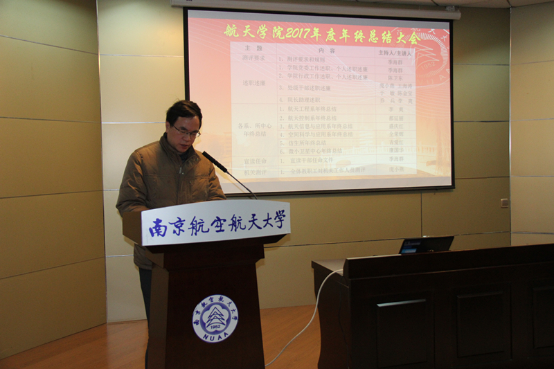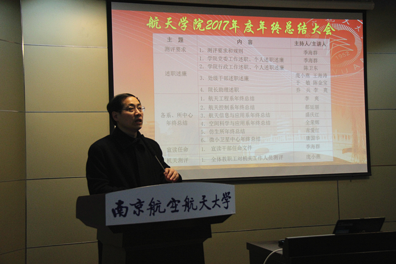会议最后,航天工程系、航天控制系、航天信息与应用系、空间科学与应用系、仿生结构与材料防护研究所、微小卫星研究中心等六个系所中心负责人分别代表自己所在部门做本年度工作总结。