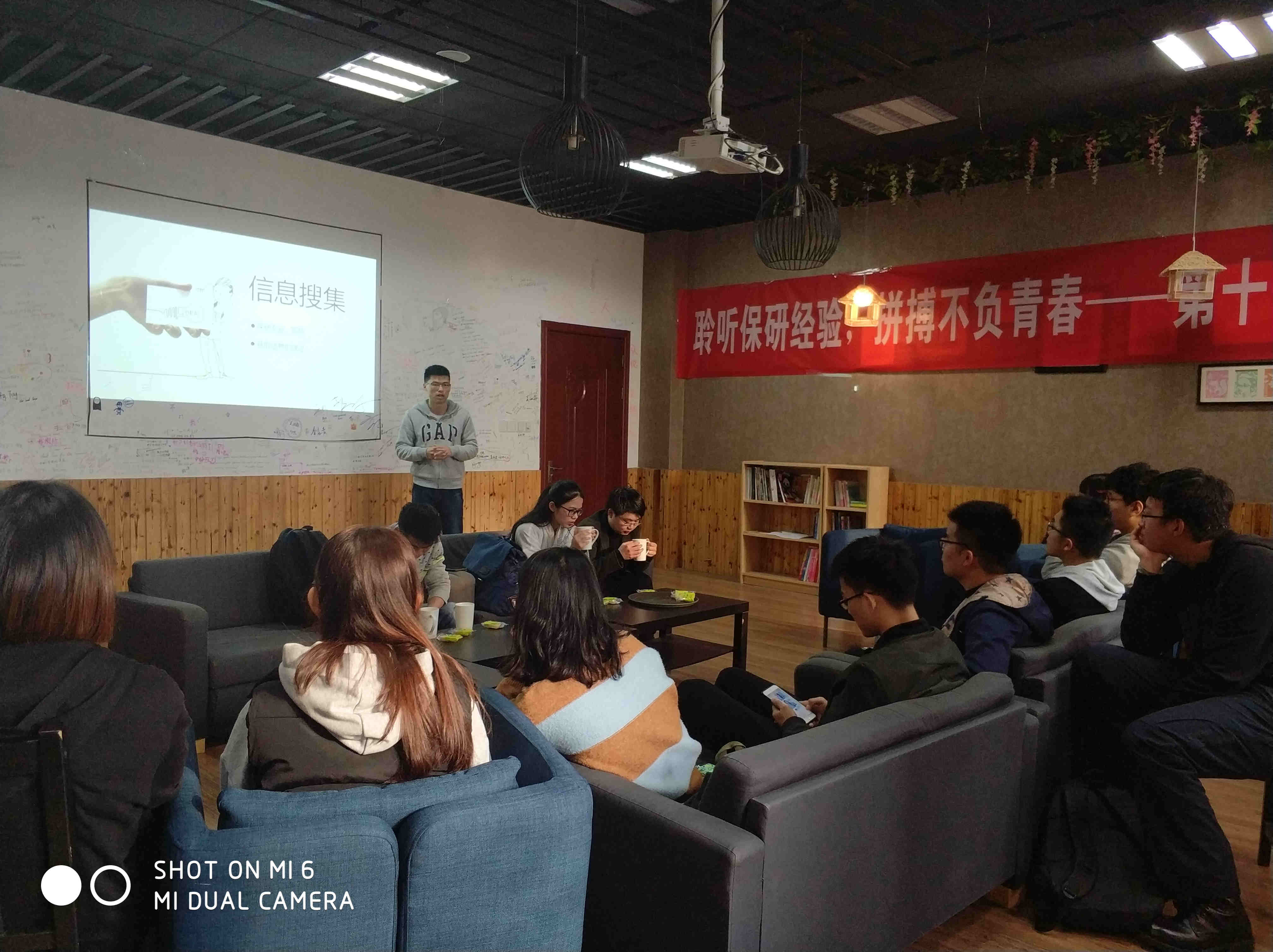 接下来,由许光坦同学进行经验交流。他细致入微的讲解了从收集信息到九月推免的全部流程。他讲到,保研就像拉力战,每一个环节都要认真准备。