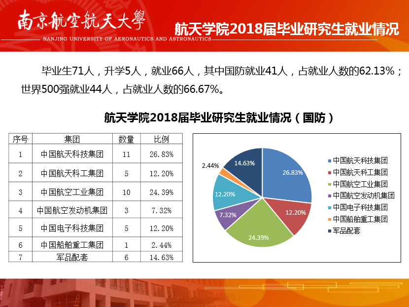 据统计,我院2018届毕业研究生共71人,其中升学5人,就业66人。本届毕业研究生中,国防就业41人,占就业人数的62.13%,世界500强就业44人,占就业人数的66.67%;国防就业去向中排名前三的单位是中国航天科技集团、中国航空工业集团、军品配套,进一步巩固了以英国正版365官方网站研究生毕业生中航工业、航天系统为主体的目标就业市场。