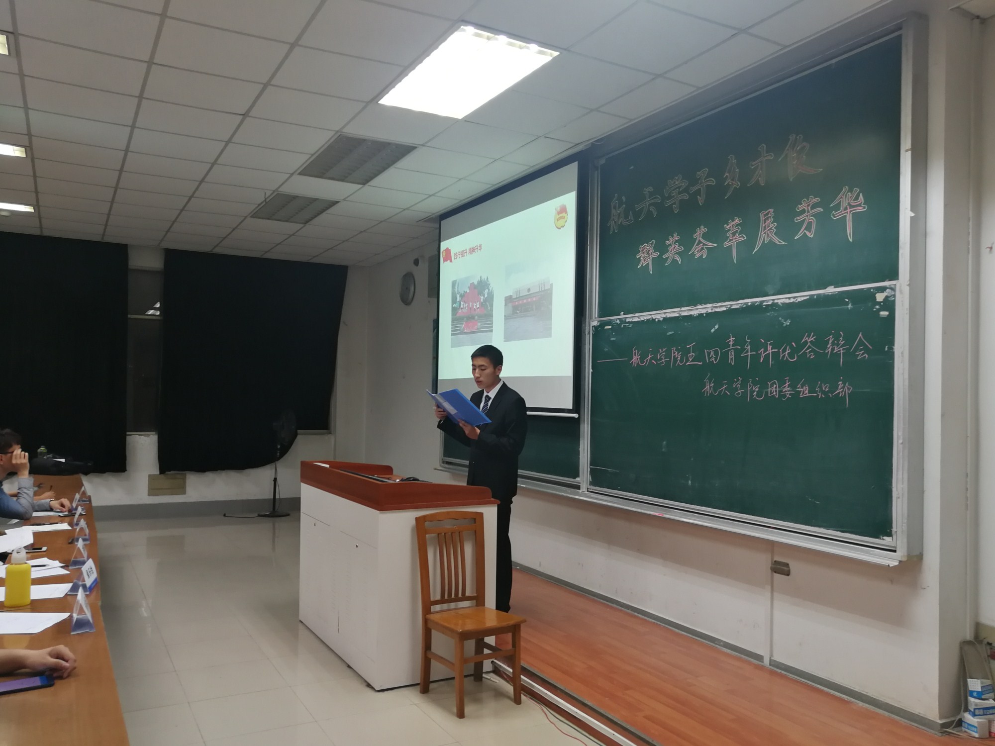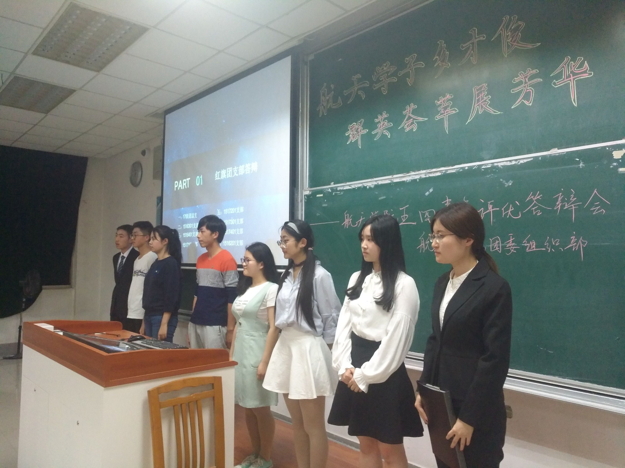 答辩分享环节,17级团总支,1516201支部等8个支部(总支)分享了支部一年的成长故事。1516401支部,1517501支部等7个支部分享了他们的团日活动成效。北斗领航团队与慕课工作室参与了优秀学生特色团队评选答辩。各个班级和团队依次分享了团队在上一年中所获得的成果并接受了评委的统一提问。