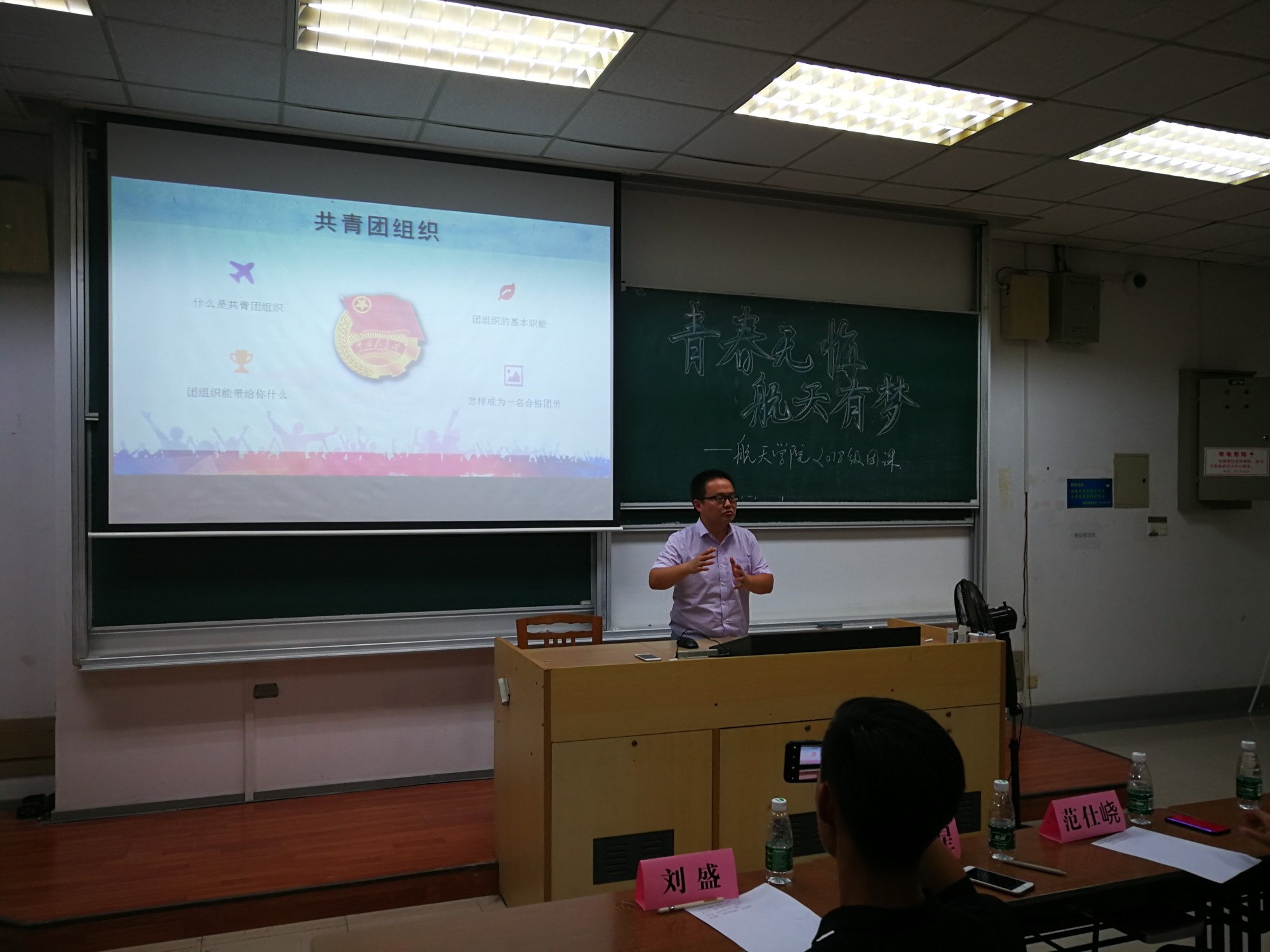 9月4日晚,英国正版365官方网站团委在将军路校区举行“青春无悔,航天有梦”2018级新生主题团课。学院团委书记管永星、2018级辅导员刘盛,2018级全体新生以及学院“北斗领航”计划成员参加活动。