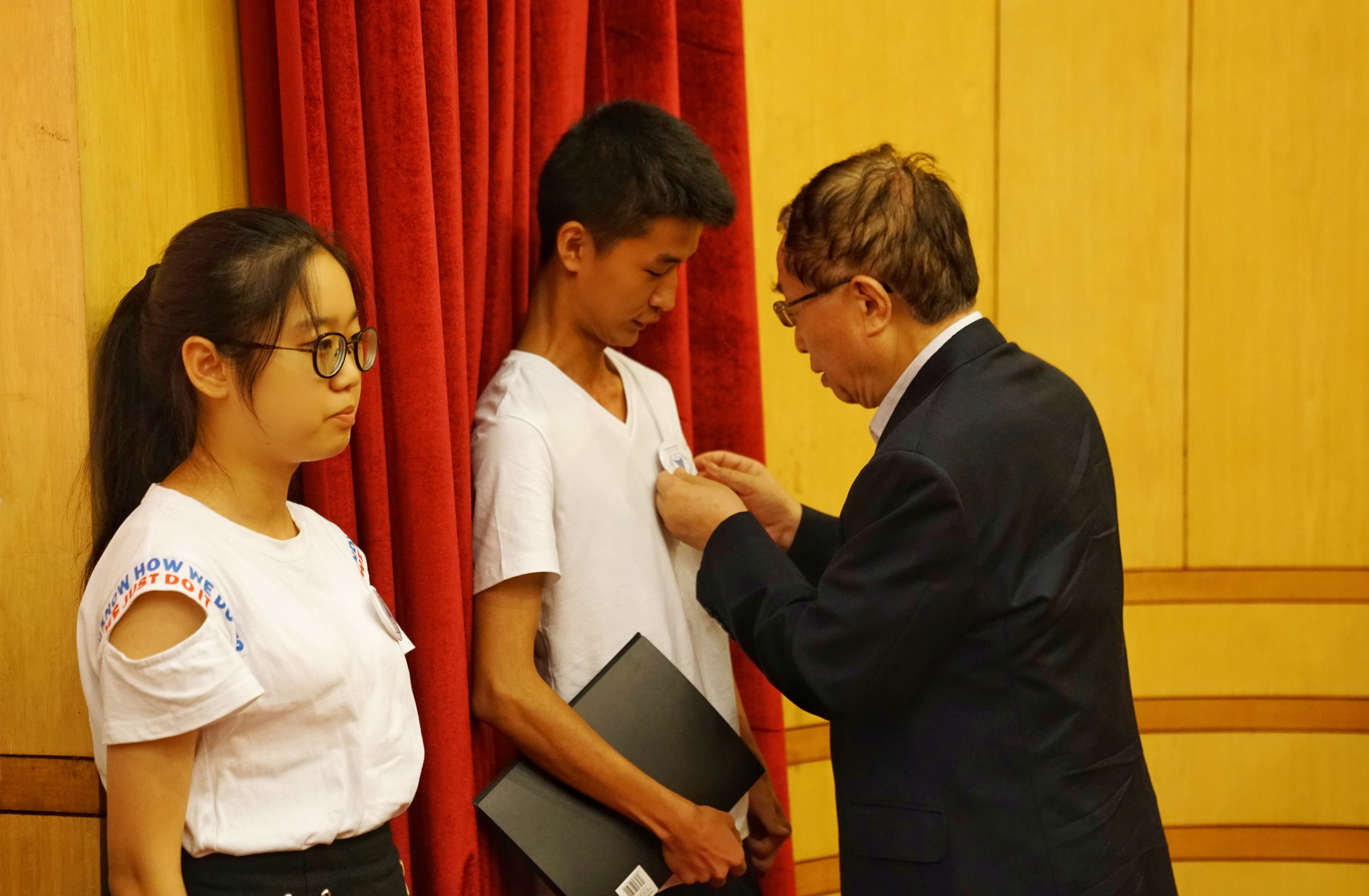 典礼上,研究生代表郑墨泓和本科生代表龚震宇同学分别进行发言,向同学们讲述了他们对航天梦的追逐与热爱;学院教师代表们也通过制作的视频表达了对同学们新征程的期待与祝福;方美华作为班主任、研究生导师代表上台发言,以“做个有‘芯’人”为主题,鼓舞新生薪火相传,逐梦南航,航天报国;新生们在典礼上朗诵《航天院赋》,“志存高远,当效羲和驭天马;肩挑重担,誓在长空牧群星”表达了作为航天新人为中国航天事业做贡献的信心与决心,并将书法作品《飞天梦》献礼学院;叶培建院长和季海群书记也上台为新生们佩戴上航天徽章。