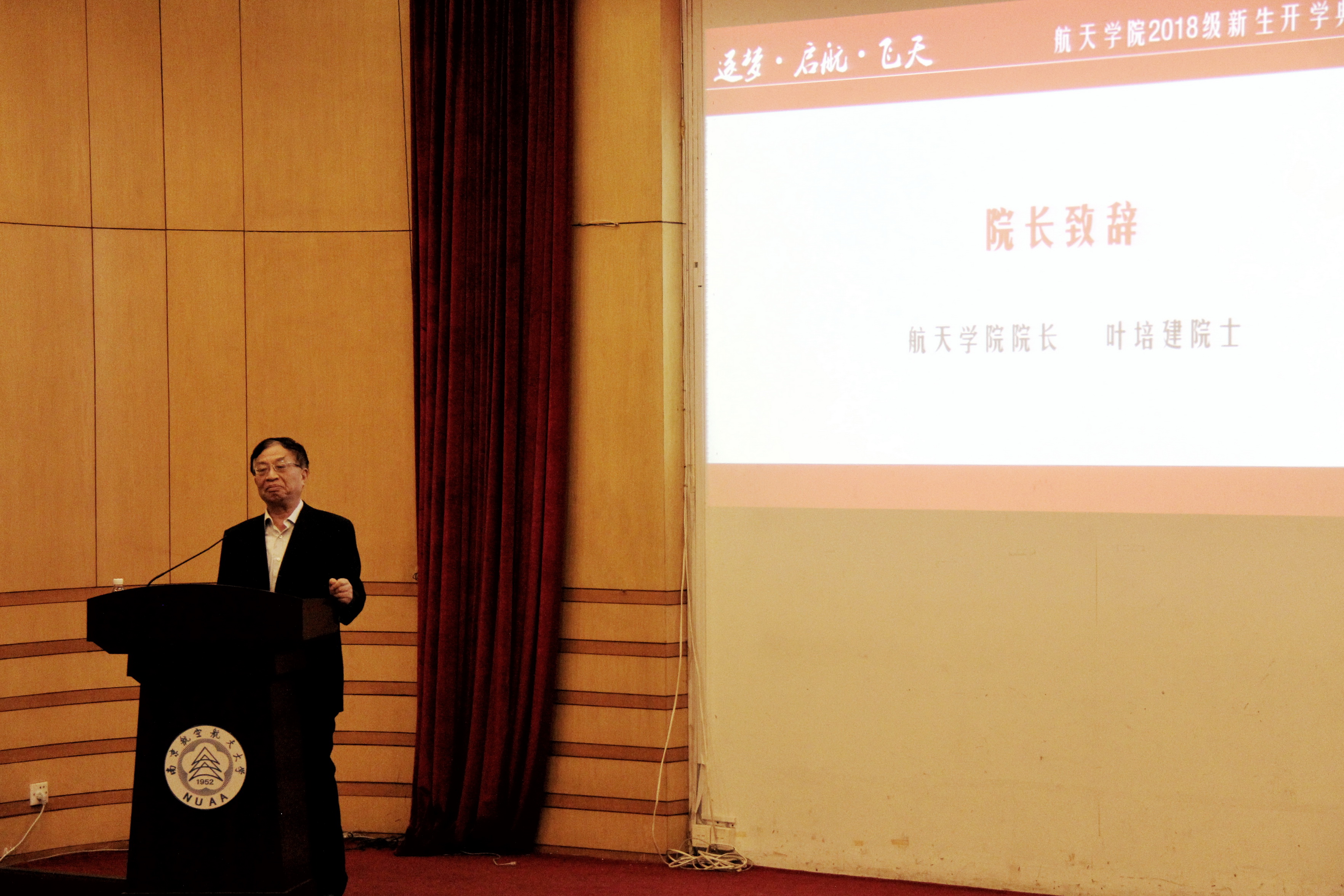 之后,由叶培建院长致辞,他为新生们讲述了中国航天事业取得的成就,描绘了未来数十年中国航天事业发展的壮丽蓝图,他说:同样作为英国正版365官方网站的“新人”,希望新生们可以和他一起努力,共同见证英国正版365官方网站的发展、见证中国航天事业的发展、见证中国成为航天强国!叶院长向新生提出了三点要求,第一是“学做好人”,要爱他人、爱父母、爱自己、爱周围的一切,要成为有道德、高素质的航天人,要为国出力,为中国梦做出贡献;第二是“要有好的身体”,健康是革命的本钱,要多注重锻炼,强身健体,为今后的奋斗打下稳固的基础;第三是“好好学习”,要用心学习,要掌握学习的方法,知道如何通过不断学习获取新的知识。叶院士的讲话让新生们领略到了中国航天领军人物的风范,同时也使新生更加明确航天报国的人生目标。