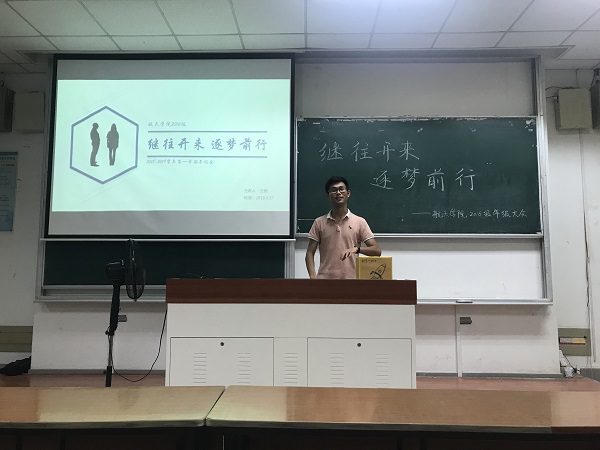 大会最后,王碰辅导员讲述了向优秀的学长学姐们了解到的学习经验,包括科创、学习、考研、保研等的许多经验,为同学们即将到来的大三生活做好铺垫。