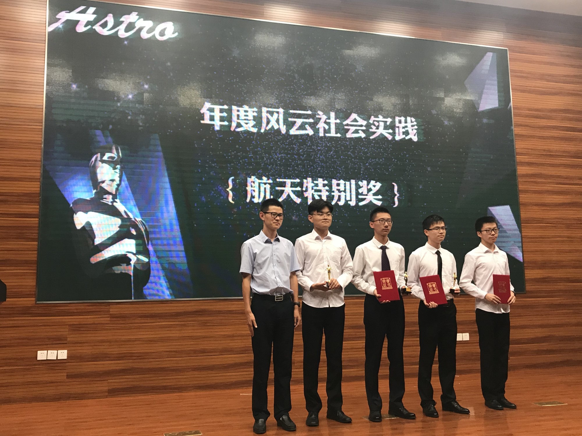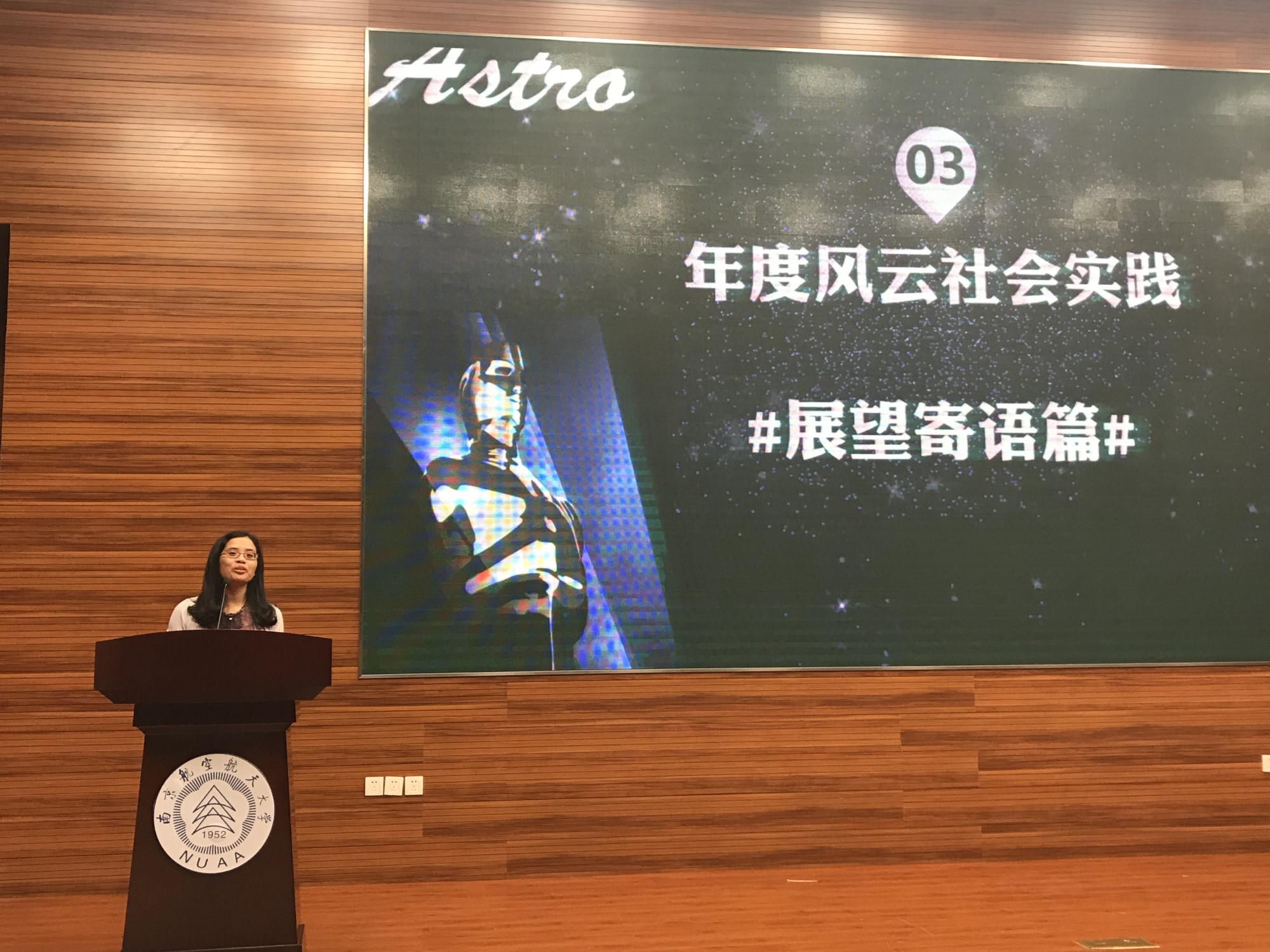 在实践分享的最后环节,航天特别奉献奖获得者“航天梦、国防志”团队为大家展示了今年实践团队中分别奔赴上海、西安、武汉等地十余家航天企业走访调研的实践所得,他们将深入航天一线进行岗位体验、人物访谈、环境感知的经历如数家珍般为同学们分享,从他们身上,全体师生感受到了作为航天人的自豪感与使命感。
