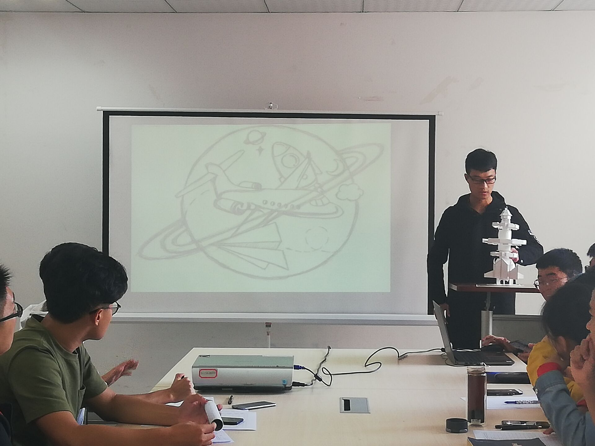 早上8点比赛正式开始,参赛选手在210有序的进行初审答辩。团队的参赛作品丰富多彩,有设计庞大的航天飞船、可以实现水上着陆的航天飞机、用于太空战的军事航天器、可以进行行星探索的探测器、用于收集太空垃圾的卫星、可随时发射火箭的组合应急系统等等。