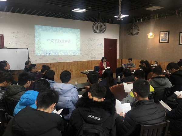 12月4日下午中乌班政策解读会暨中乌本导见面会在将军路校区经管咖啡厅举办。学院副院长盛庆红、中乌班班主任朱桂平、中乌班本科生导师、18级辅导员刘盛参与了此次活动,1518100班全体同学到场。