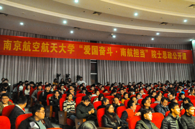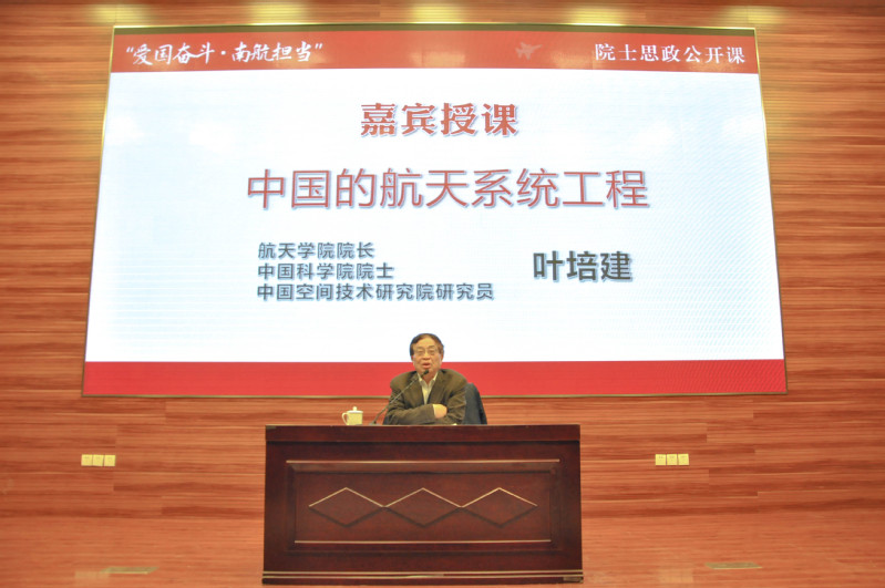 首先播放开场视频——《新闻联播》关于习近平总书记会见探月工程“嫦娥四号”任务参研参试人员代表的相关报道和《东方时空》独家专访叶培建院士的采访视频,季海群详细介绍了叶培建院士的履历。随后举行南航思政工作首席专家手印采集仪式,叶院士留下手印并签名,学校将把这枚珍贵的手印在校史馆永久珍藏。紧接着,叶院士为师生们精彩开讲《中国的航天系统工程》,叶院士围绕“当今的空间为什么值得我们关注”、“航天的系统工程”、“空间飞行器的组成”、“航天器研制的全过程”、“飞行器的组织系统”、“航天人的精神”等六个方面进行了授课,两个小时的授课中金句频出、掌声雷动,“拿回月球的石头”、 “到2020年,太空可能只有中国人的空间站”、“没有当初的坚持,也就没有嫦娥四号的落月背”、“航天成功归于两个归零,技术归零,管理归零”、“系统工程,息息相关,缺一不可”、“人没有点精神,一定干不出事儿,‘两弹一星’精神,载人航天精神是航天人的传统”等金句,无不让师生们深刻体会到习近平总书记所说的中国智慧、中国方案、中国力量,无不让师生们感受到叶院士深厚的航天情怀、爱国担当。