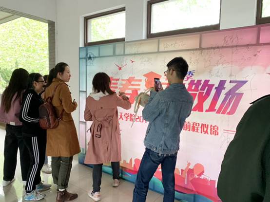 茶话会开始前,毕业生在签名墙前合影留念,在留言板上写下对学校、学院的祝福和寄语,走过长长的红毯步入活动会场,营造了温馨浓厚的互动氛围。