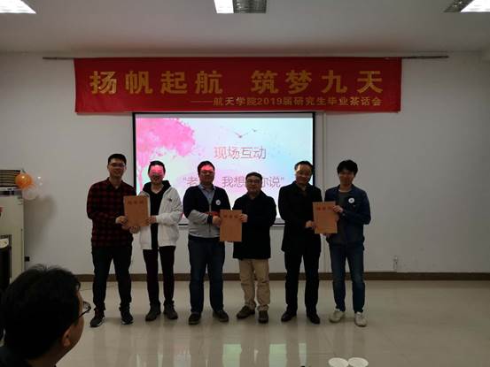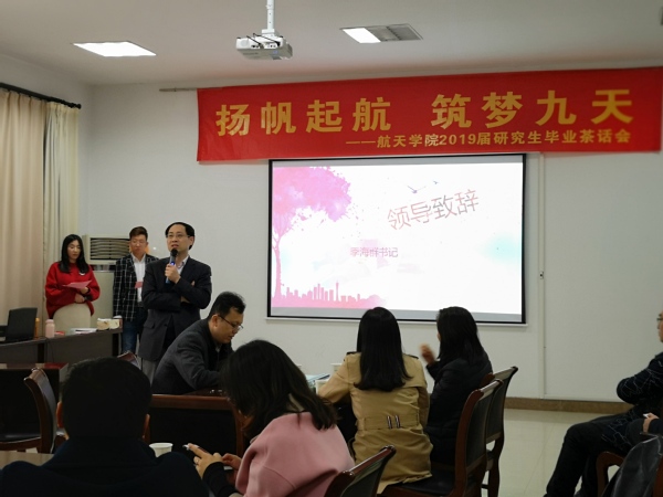 茶话会在一段生动温暖的回忆视频中开场,让每位毕业生感受时光的匆匆、校园生活的丰富多彩以及研究生师生点滴情谊。学院党委书记季海群发表致辞,对全体研究生顺利毕业表示祝贺,对辛勤付出的老师表示肯定;季书记回顾了近年来英国正版365官方网站的快速发展,以及当前面临的形势和机遇,勉励毕业生在新的就业岗位和深造平台能够发扬航天精神,再接再厉、再创佳绩;他引用“聚似一团火,散做满天星”为毕业生们送上了情深意长的祝福。