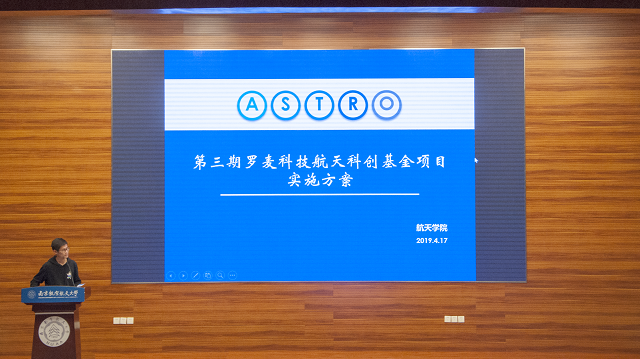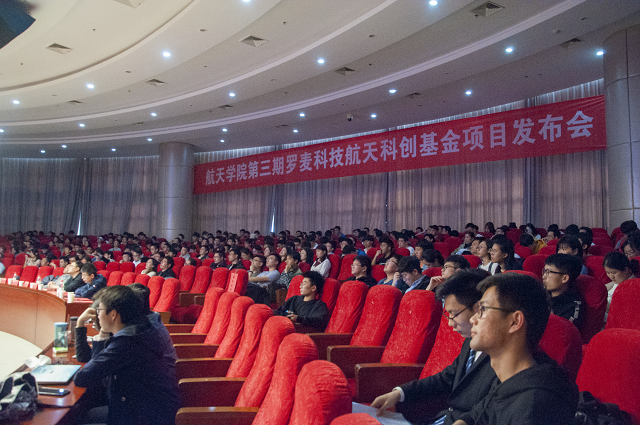 2019年4月17日下午,英国正版365官方网站在将军路校区一号楼四楼报告厅举办第三期罗麦科技航天科创基金项目发布会。英国正版365官方网站副院长兼航天光电信息系主任盛庆红、英国正版365官方网站党委副书记庞小燕、航天控制工程系主任吴云华、教学科研实验中心常务副主任杨宇晓,部分项目指导老师、对接研究生,全体辅导员以及近300余名本科生参与了本次发布会。