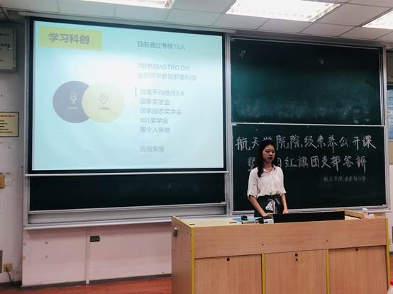大会开始后,各支部代表依次上台分享,分别从支部基层组织建设、思想引领、学风建设、志愿服务、社会实践、文化建设等方面进行展示。各支部展示内容丰富多彩,特色鲜明,分享的经验和心得也非常接地气。1517100支部介绍了以增强中乌航天班国内国外学生交流的“中乌桥”;1517401支部使用番茄APP进行班级自己制度的管理,仿照慕课讲堂开展班级讲堂;1517301支部致力于打造“学习型、服务型、创新型、活力型、标准型”的五型团支部。各支部答辩结束后,评委对答辩情况进行点评,让在场的各位同学充分认识了班级团支部的优势和不足,取得的进步以及对未来的展望。
