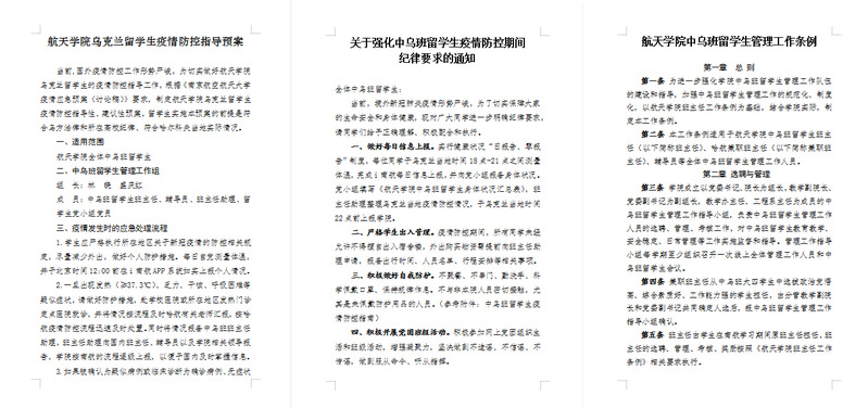 自疫情爆发以来,学院密切关注中乌班留学生的学习生活状况,多次召开党委会、党政联席会,专题讨论学院疫情防控指导工作,为学院疫情防控工作指明方向。学院成立境外留学生疫情防控领导小组和工作小组,全面指导学院中乌班留学生疫情防控工作。凡事预则立不预则废,为使防“疫”有方,学院制定了《中乌班留学生疫情防控预案》,为可能发生的疫情突发事件提前做好预案;防“疫”有规,学院制定《中乌班留学生疫情防控纪律要求》等规章制度,让疫情防控工作有规可依;防“疫”有序,学院制定《中乌班留学生管理工作条例》,明确各方职责,充分调动各方力量,让防“疫”工作更加有序。