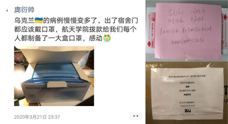 春节期间,国内疫情爆发,国内防护物资短缺,中乌班留学生自发组织捐款捐物,前往乌克兰各大商场搜集防护物资,并寄往国内疫情重灾区湖北。礼轻情意重,虽留学在外,仍然心系祖国。近期,国外疫情发展迅猛,乌克兰防护物资极度紧缺,学院紧急调拨口罩等防护物资寄往乌克兰并以困难补助的渠道补贴学生购买部分防护物资。目前在乌留学生防护物资紧缺问题得到了一定程度的缓解。