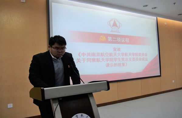 会上,学院组织员丁亮宣读了《中共南京航空航天大学英国正版365官方网站委员会关于申请成立英国正版365官方网站学生党总支的批复》。学院党委副书记林晓同志作了题为《凝心聚力再出发,砥砺奋进新征程,为培养社会主义建设者和接班人不懈奋斗》的学生党建工作报告,报告阐述了党总支成立的背景以及前期筹备情况,全面回顾总结了近年来学院学生党建主要工作及取得的丰硕成果,并对党总支未来工作进行了规划与展望。