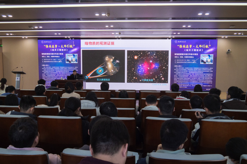 接着,常院士通过暗物质的发现、为什么要探测暗物质、如何探测暗物质三部分,讲述了暗物质探测的背景和发展历程。课程有别于科普类讲座,突出“拔尖类学生、高阶性内容、研究生教学”等特色,常院士基于牛顿万有引力定律、爱因斯坦广义相对论、61种基本粒子的标准粒子物理模型等物理学理论,讲解了星系旋转曲线的测量、引力透镜效应、暗物质粒子的性质,说明了暗物质、暗能量研究的科学意义,并介绍了通过高能粒子碰撞模拟宇宙大爆炸的加速器探测、地下直接探测暗物质粒子以及空间间接探测暗物质粒子相互碰撞后产生的可见粒子三种探测路径。我院微小卫星工程研究中心参与了热控设计、热仿真以及为“悟空”做电磁兼容性实验、热真空、热循环、热平衡试验等工作。
