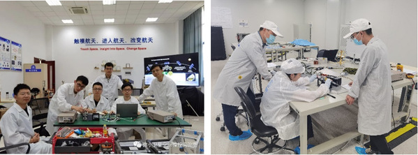 图5“ 锦囊一号”在南航(左)及卫星总装现场(右)联试测试