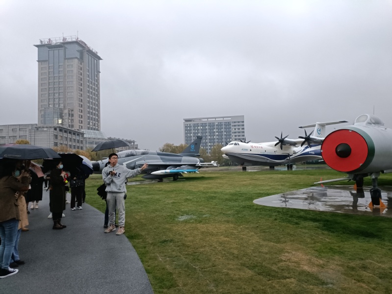 随后,师生党员们一起前往“御风园”航空航天教育教学实践基地,通过近距离接触这些国之重器,在沉浸式感受国防文化中坚定信念,强化责任担当。2020级硕士生党支部支委们为大家依次介绍了“御风园”中的各种航空航天器,包括新中国自行生产的第一型飞机初教5、歼-8Ⅱ歼击机、大型水陆两用飞机AG600、长征四号运载火箭等。在场师生党员感受到了我国航空航天事业的发展成就,并为之感到振奋和自豪。