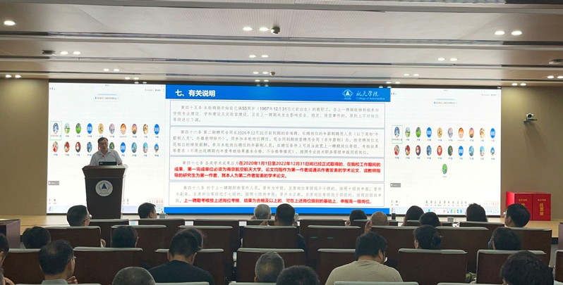 会上,常务副院长陈金宝代表学院领导班子,通报了本轮岗位聘任工作的进度。他强调岗位聘任是一项关乎本院全体教职工切身利益的重要工作,时间紧、任务难、责任重。在上一轮岗位聘任方案的基础上,学院通过座谈会形式广泛征求各系教师意见,严格履行民主程序,结合学校要求和学院实际制定了本轮岗聘方案。新方案的岗位设置与聘任坚持学科导向、强化岗位、级岗分离、突出业绩的指导思想,做到分类管理、按需设岗、按岗聘任、优绩优岗。