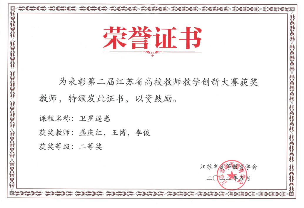 《卫星遥感》课程(课程团队:盛庆红、李俊、凌霄、康国华)秉承努力建设航天强国和世界科技强国使命,紧密对接国家重大战略需求,突出航空航天办学特色。课程历经十余年建设,教学内容源于主讲教师参与的多个航天项目,以航天遥感型号任务为驱动,以学生发展为中心,创新实施“对抗与辩论赛”式实战训练教学模式,着力培养学生家国情怀、系统思维和自主创新能力。此外,课程团队还曾荣获第二届江苏省高校教师教学创新大赛二等奖。